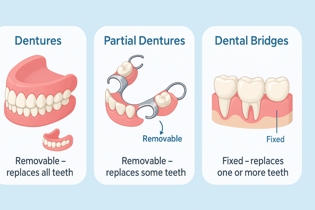 - Partial dentures: Patients who have lost several teeth can opt for this option, where a set of removable teeth is provided to the patient that can be taken out for cleaning.